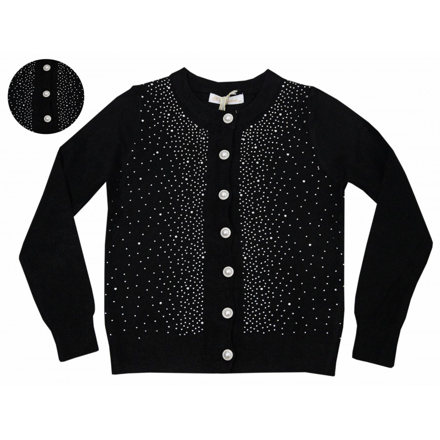 Детска жилетка за момиче от фино плетиво в черно, декорирана с камъни и красиви копчета.