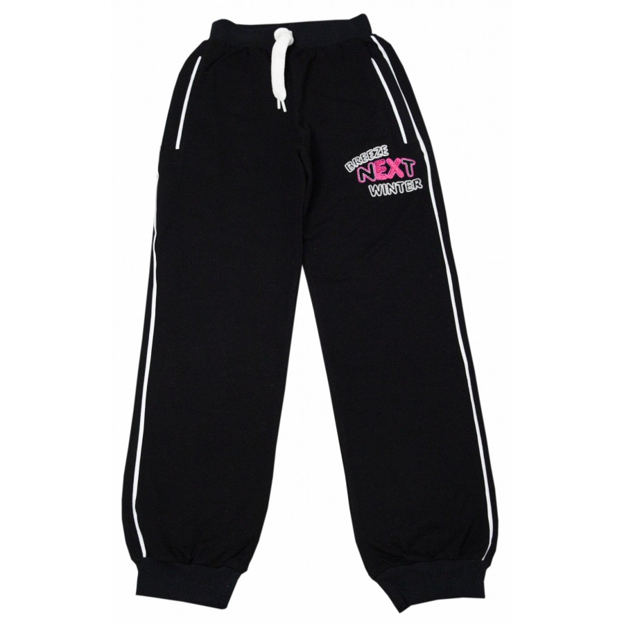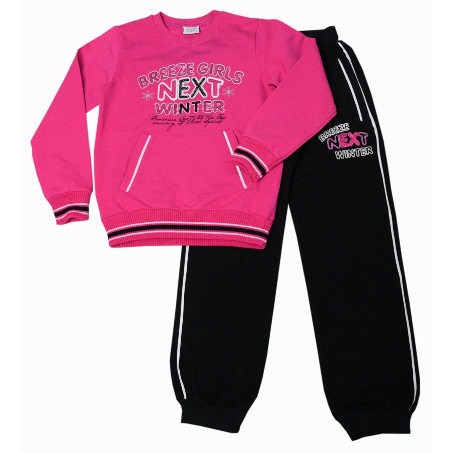 Красив и практичен детски спортен комплект за момиче от две части, изработен от висококачествена материя. Блузата е в цикламен цвят със свободна кройка, дълги ръкави, джобове в предната част и апликация с надписи. Долнището е в черно с ластична талия, бели кантове и бродерия надписи на левия крачол. Този комплект осигурява удобство и свобода на движението през целия ден. Подходящ е за всякакъв вид спорт. Лесен за поддръжка, комплектът може да се пере в пералня без риск от загуба на форма или цвят