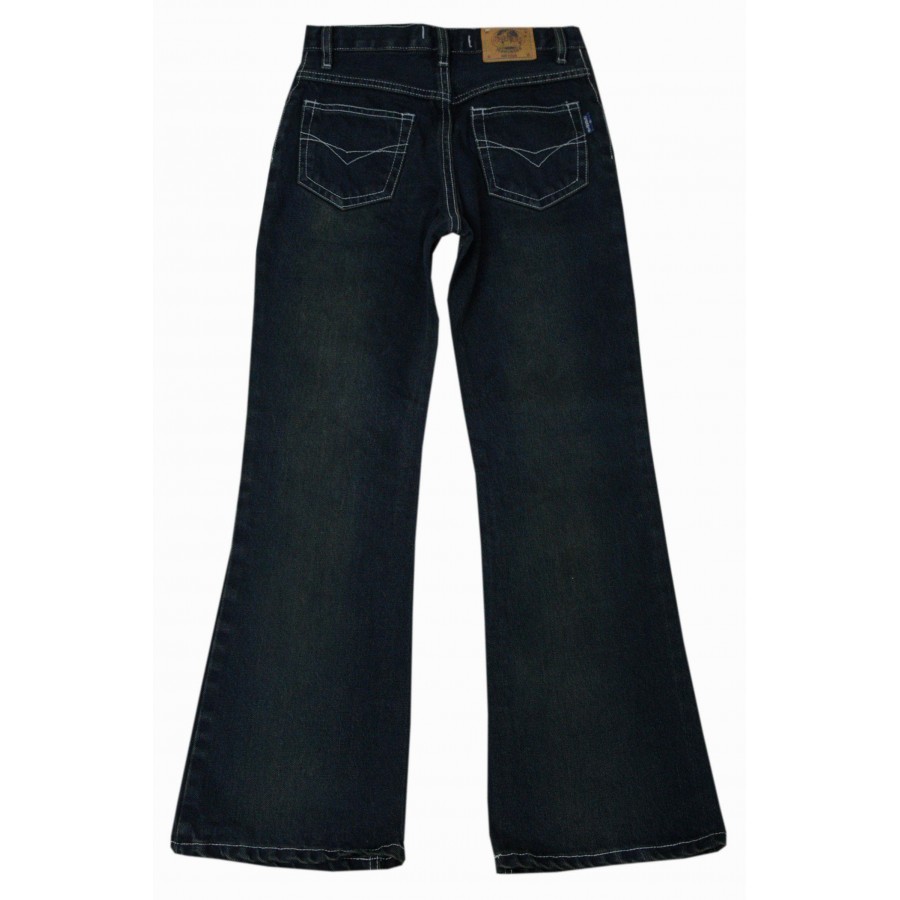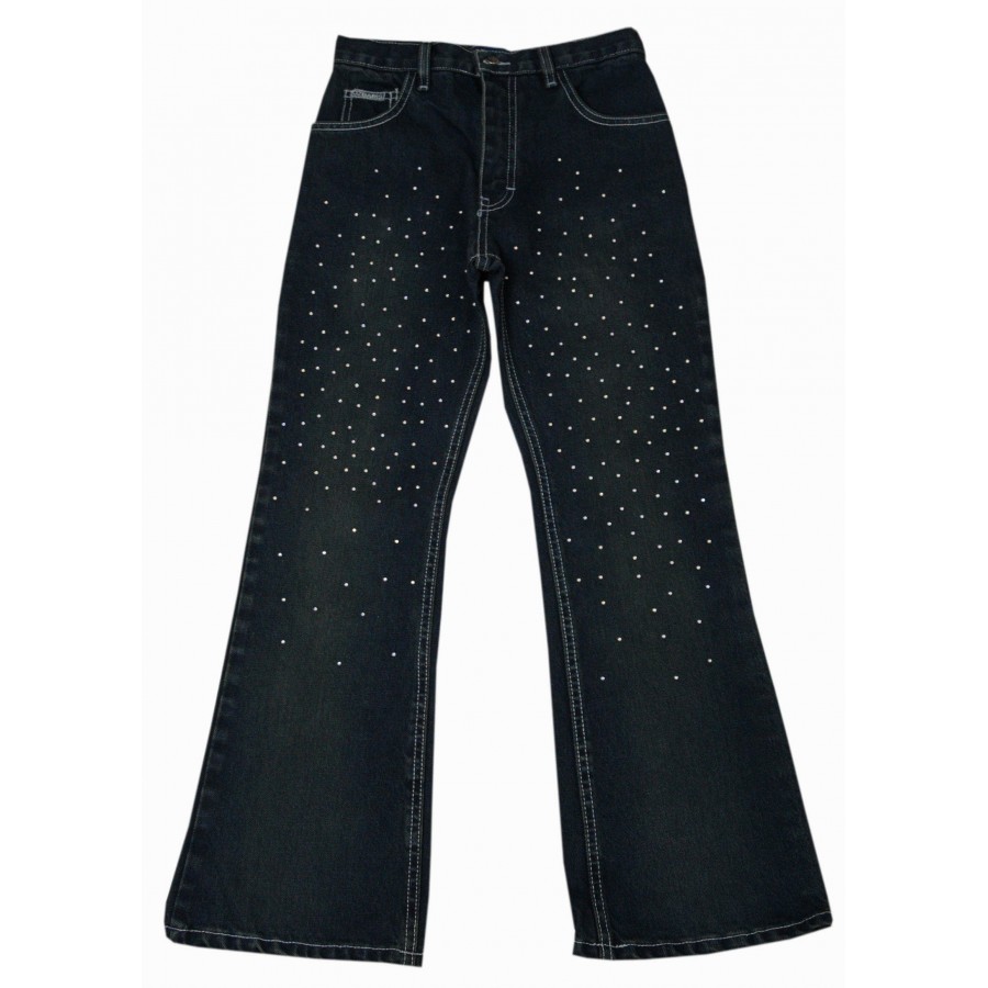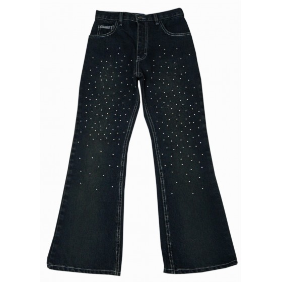 Красиви детски дънки за момиче с камъни, изработени от висококачествена деним материя. Закопчаването на модела е с цип и копче. Дънките са с широк крачол, имат джобове отпред и на гърба. Подходящи са за носене през сезоните есен и зима. Дънките лесно се съчетават с блузи, ризи, пуловери и суитшърти. Лесни за поддръжка, дънките могат да се перат в пералня без риск от загуба на форма или цвят.