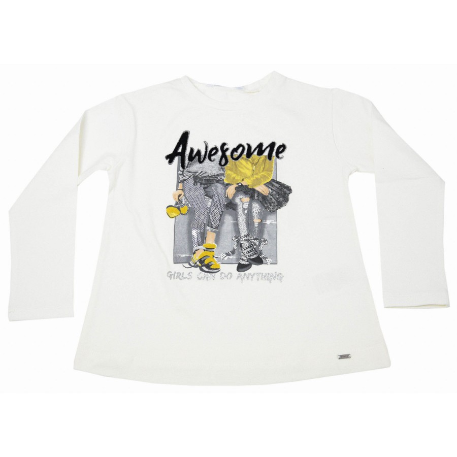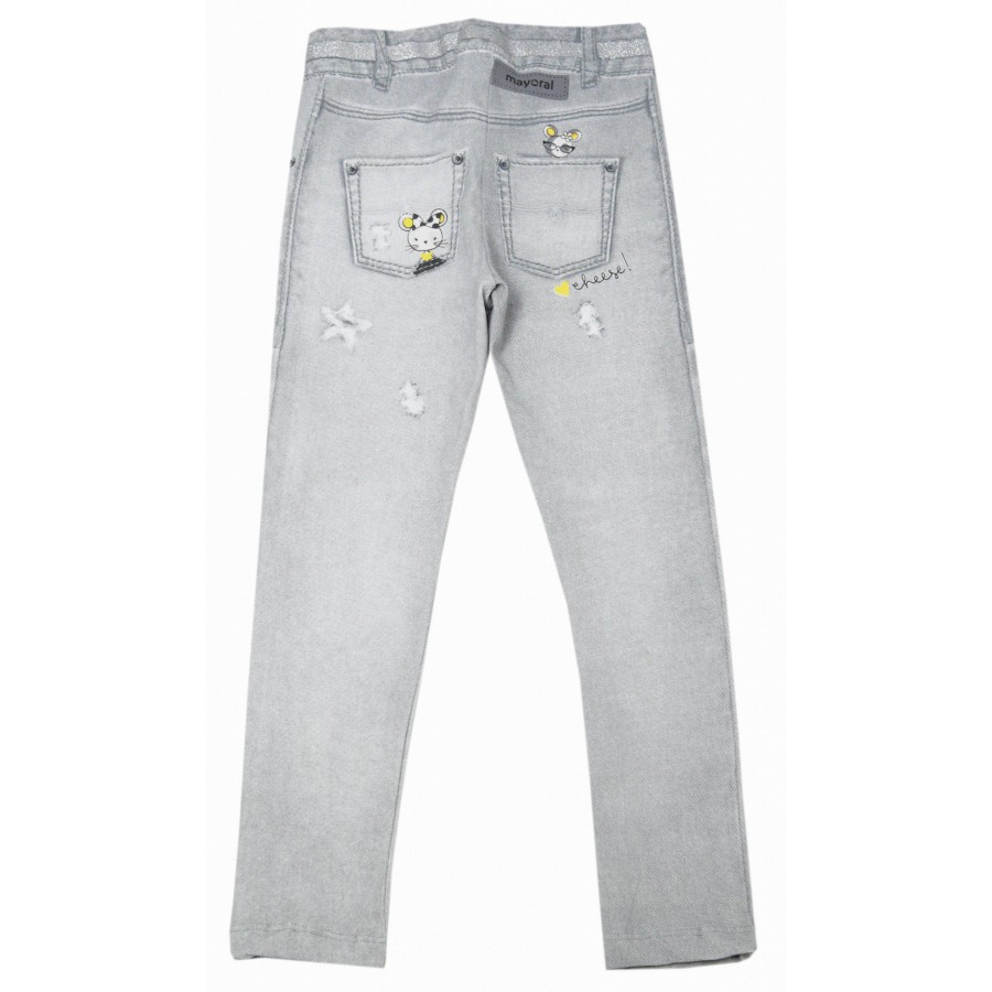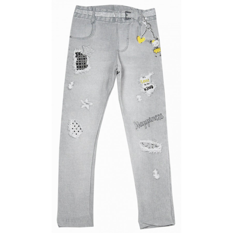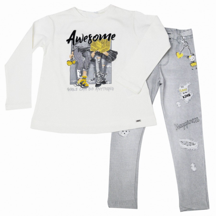 Красив детски комплект за момиче от две части с блуза и клин. Модела е изработен от висококачествена материя. Блузата е в цвят екрю с красива апликация в сиво и жълто, обло бие и дълги ръкави. Клина е с ластична талия в сив цвят с дънков принт на колан, кръпки, джобове и надписи. Комплекта осигурява удобство и свобода на движението през целия ден. Лесен за поддръжка, комплектът може да се пере в пералня без риск от загуба на форма или цвят.