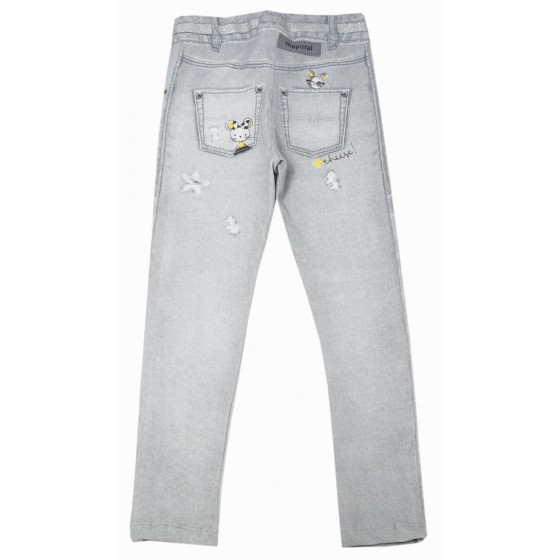Детски комплект за момиче от две части с блуза в цвят екрю с апликация и сив клин с дънков принт.