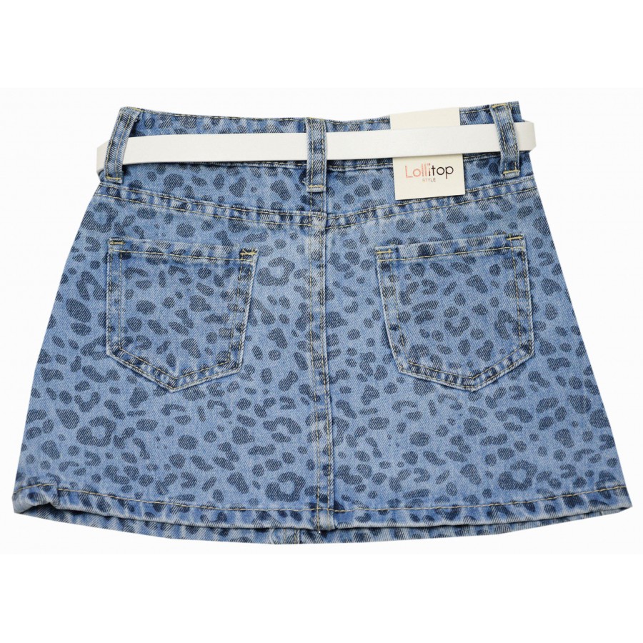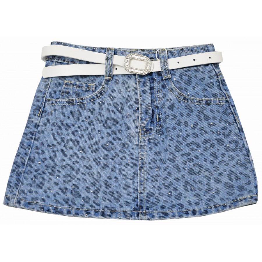 Красива детска дънкова пола с аксесоар колан, изработена от висококачествена материя. Модела е в светлосин дънков нюанс, с принт на животински шарки, камъни в предната част и джобове. Закопчаването на талията е с цип и копче, от вътрешната страна има ластик за регулиране на талията. Дънковата пола е лесна за съчетаване с блузи, тениски, суитшърти или пролетни якета. Лесна за поддръжка, полата може да се пере в пералня без риск от загуба на форма или цвят.