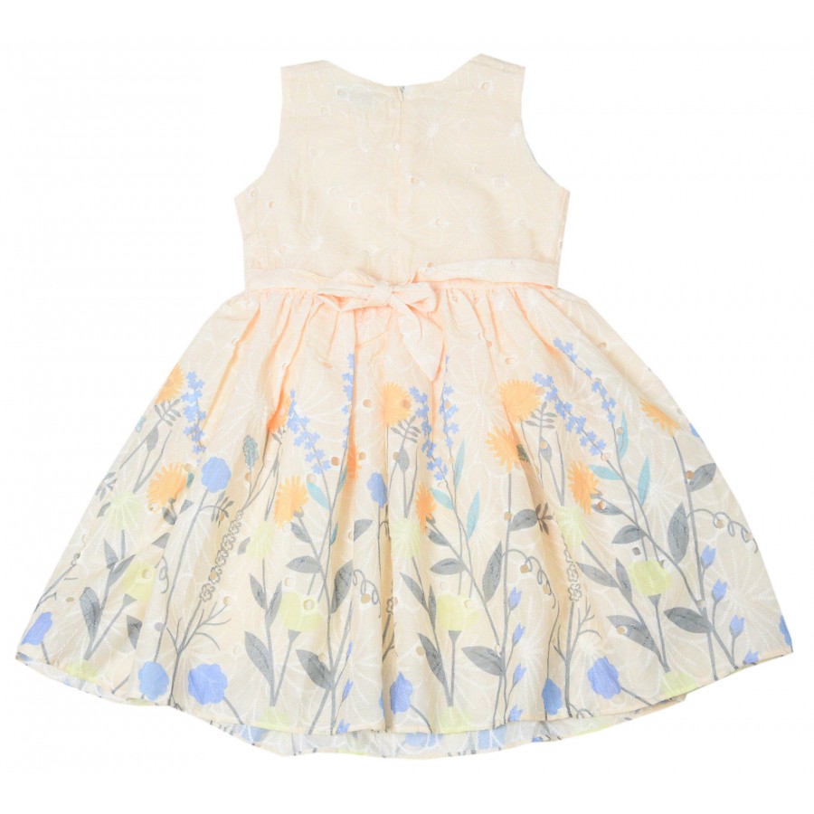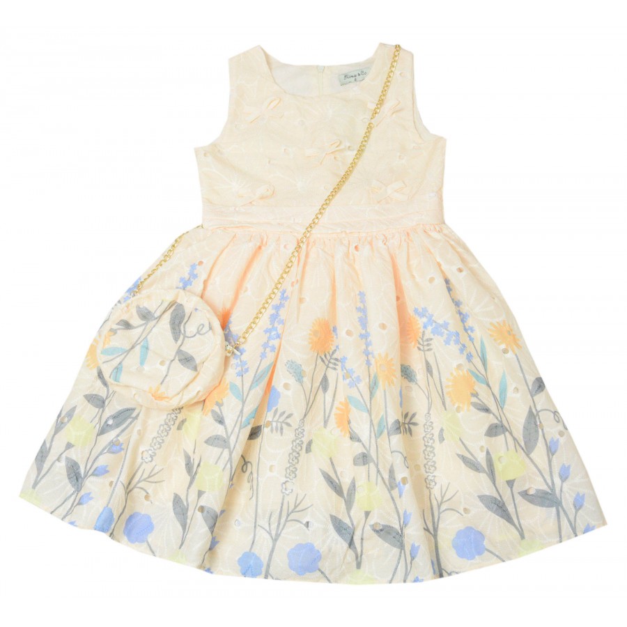 Красива детска лятна рокля, изработена от висококачествена материя. Модела е от дантела в бежов цвят с флорален принт, без ръкави, горната част е с панделки, на талията в предната част има пришит колан. Роклята на гърба има цип за лесно обличане и събличане и колан за регулиране на талията. Чантата е от материята на роклята със закопчаване с цип. Подходяща е за летни игри, разходки и почивка край морето. Лесна е за поддръжка, може да се пере в пералня без риск от загуба на форма или цвят.