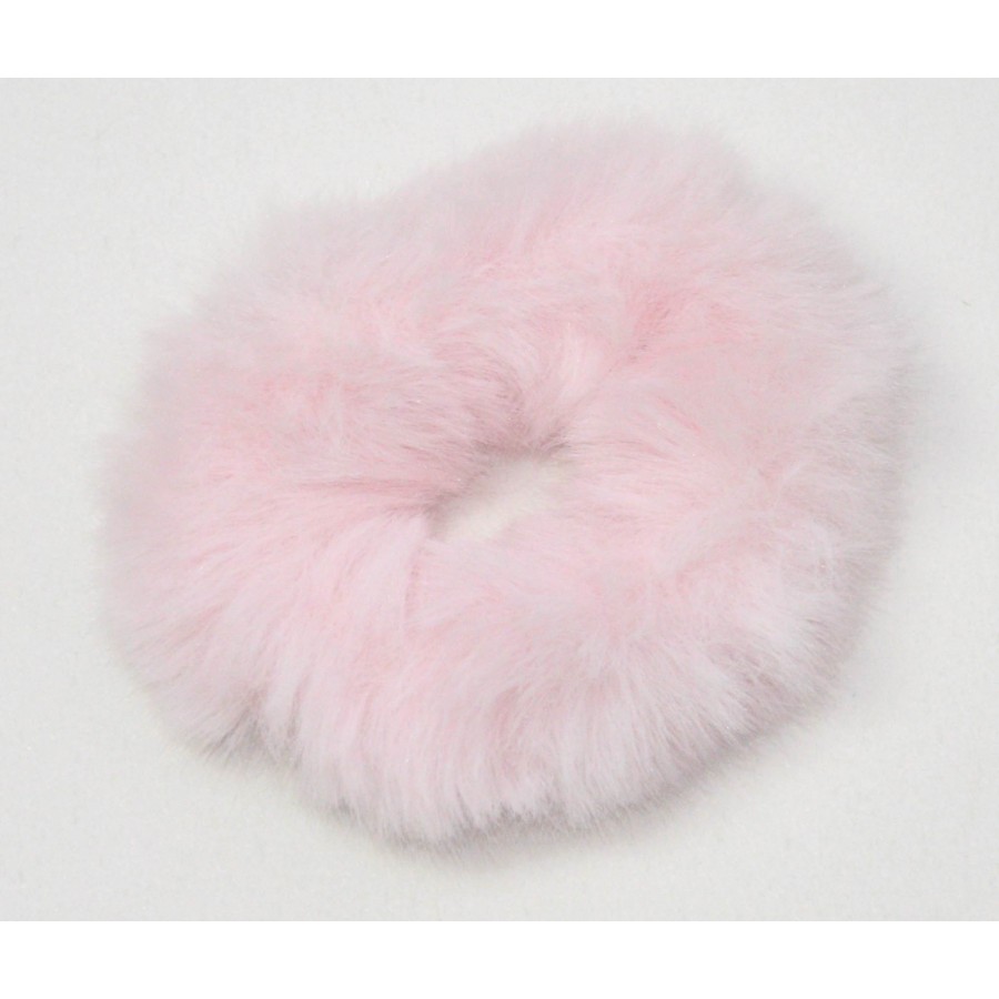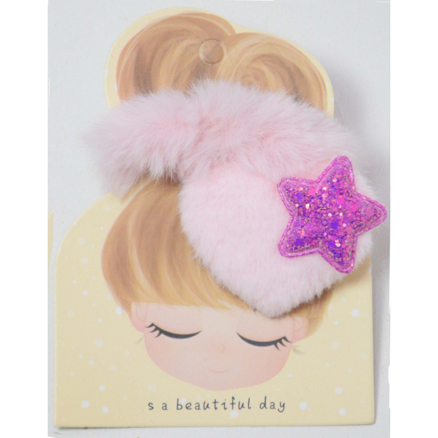 Детски комплект аксесоари за коса за момиче състоящ се от пухкави розови скрънчи и шнола.